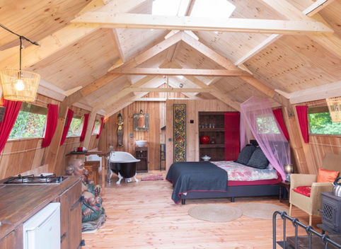 In onze twee-persoons lodges is het romantisch 'kamperen', maar dan met een echt bed, een ligbad, een separate douche, een toilet, een keukentje en een houtkachel. Voor d ekoudere dagen kan de CV aan....